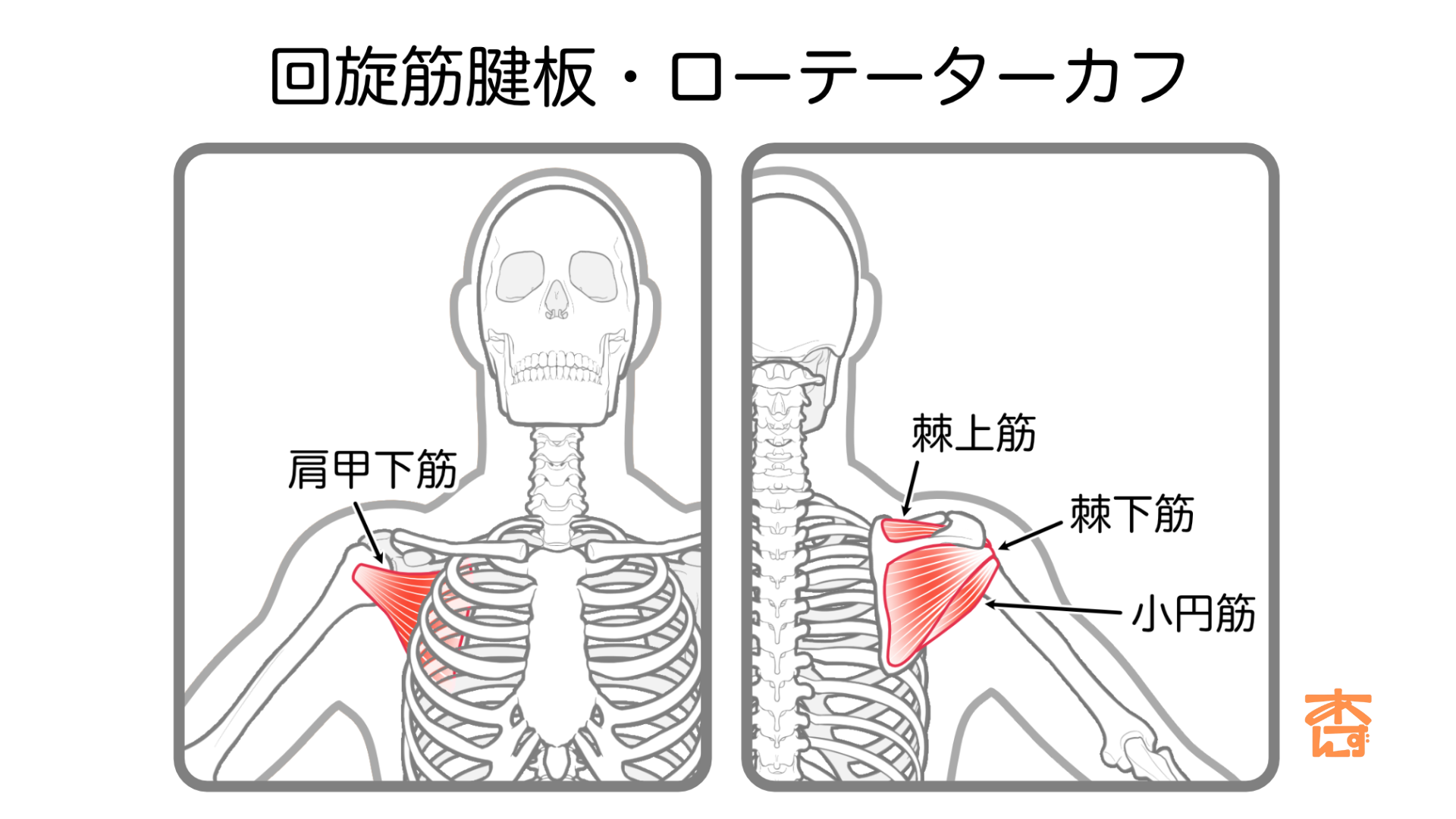 棘上筋・棘下筋・小円筋・肩甲下筋という4つの小さな筋肉で構成されており、腕が正しい軌道で動けるように肩関節を内側からしっかりと支えています。