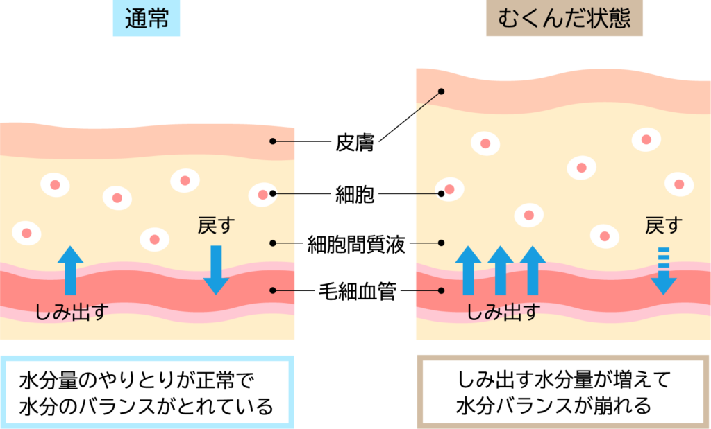 それが何らかの影響を受けてバランスを崩すことで吸収が追いつかず、水分が異常に外へ漏れてしまうと皮下に水分が溜まりむくみを起こします。