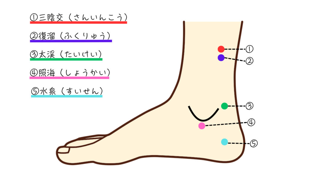 ④照海(しょうかい)内くるぶしのすぐ下にあるくぼみにあります。
