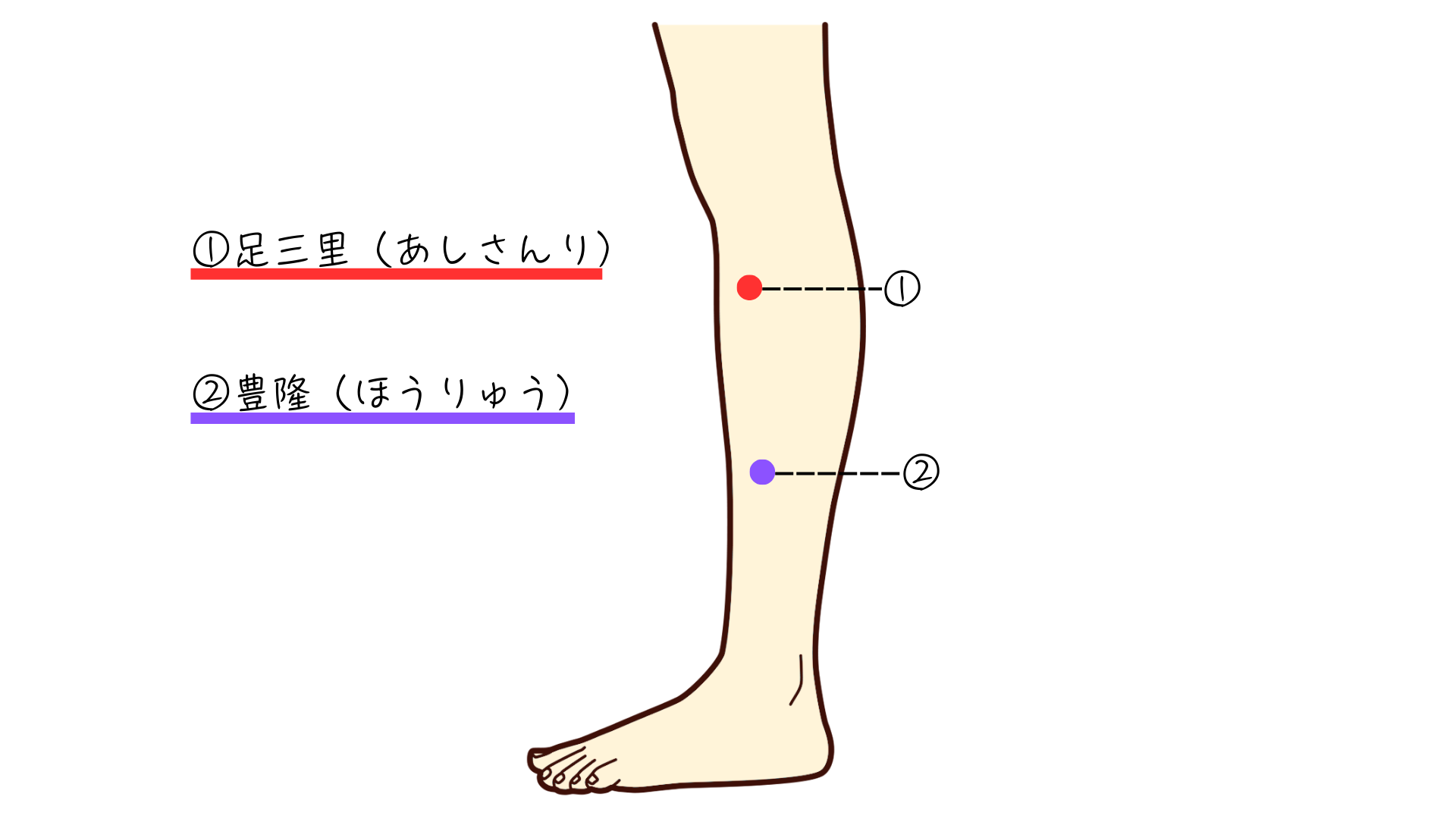 ②豊隆(ほうりゅう)膝の外側の関節の隙間から外くるぶしとの真ん中にあり、筋肉が最も盛り上がっているところにあります。