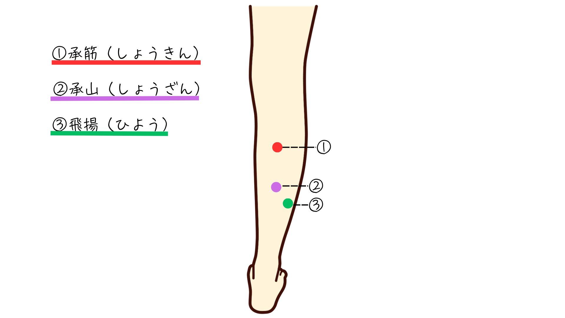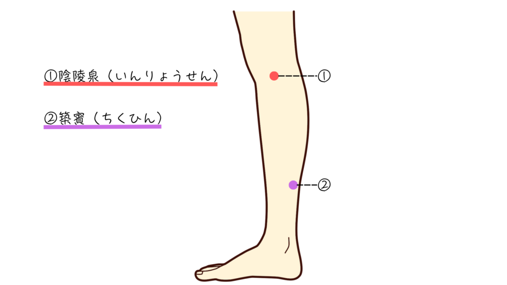 ①承筋(しょうきん)つま先立ちをしてアキレス腱を沿って上がっていき筋肉が盛り上がったところで止まるくぼみにあります。