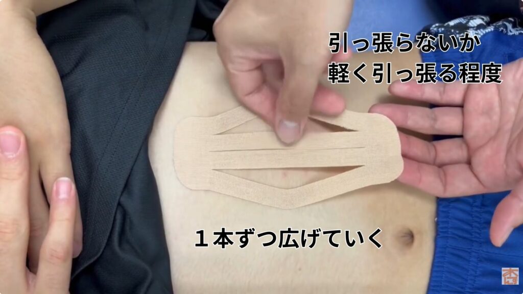 テープの真ん中に痛めている所が来るようにしながら、一本ずつ軽く広げていきます。