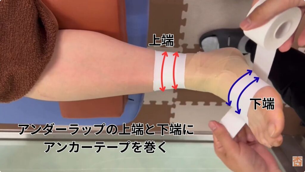 前足部につけたアンカーテープの所から始めて踵の後面を通って反対側に移ります。
