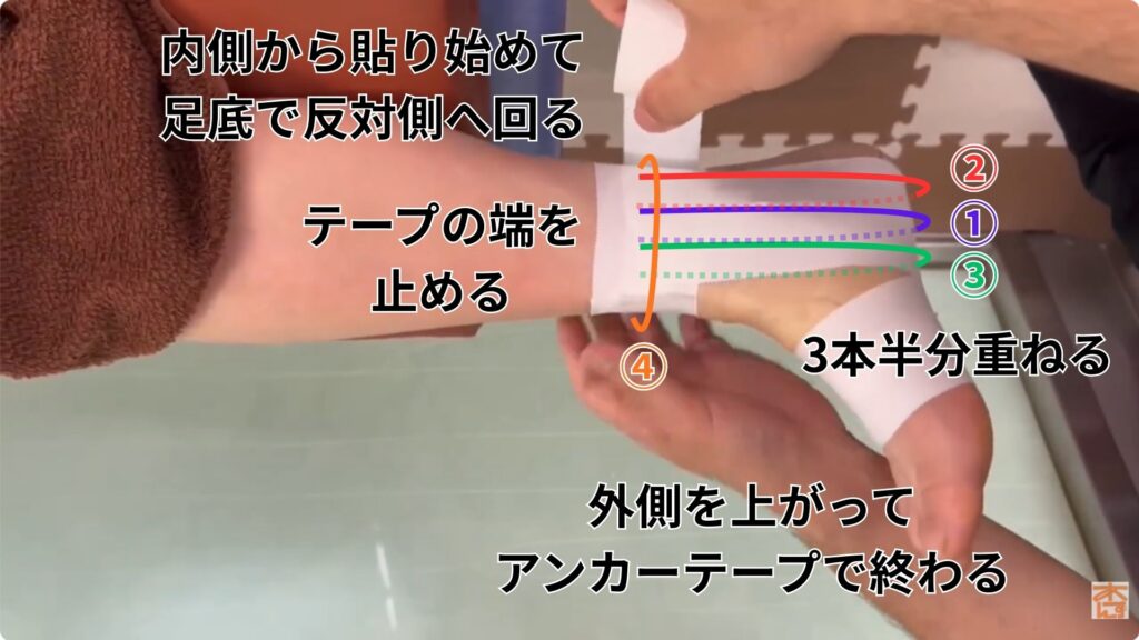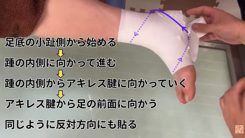 足底の母趾側から貼り始めて踵の外側を通ってアキレス腱から足関節前面に向かって行きます。