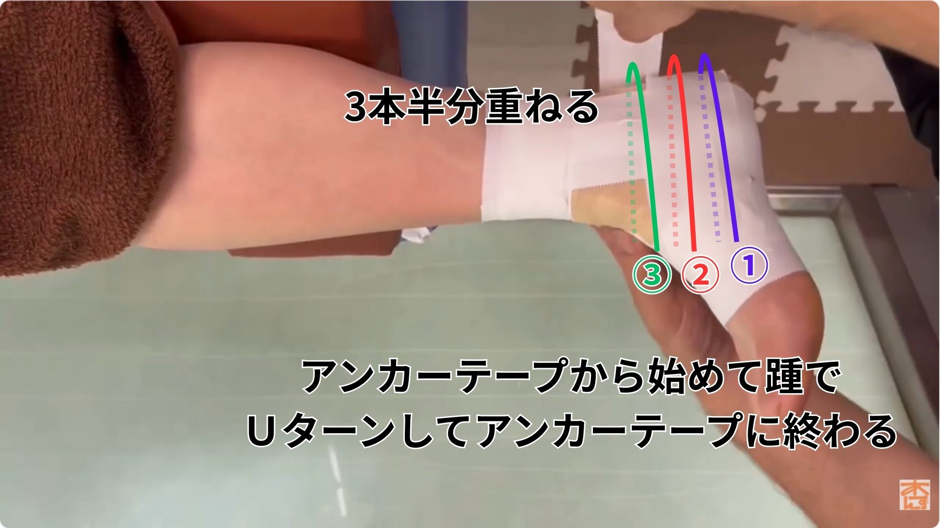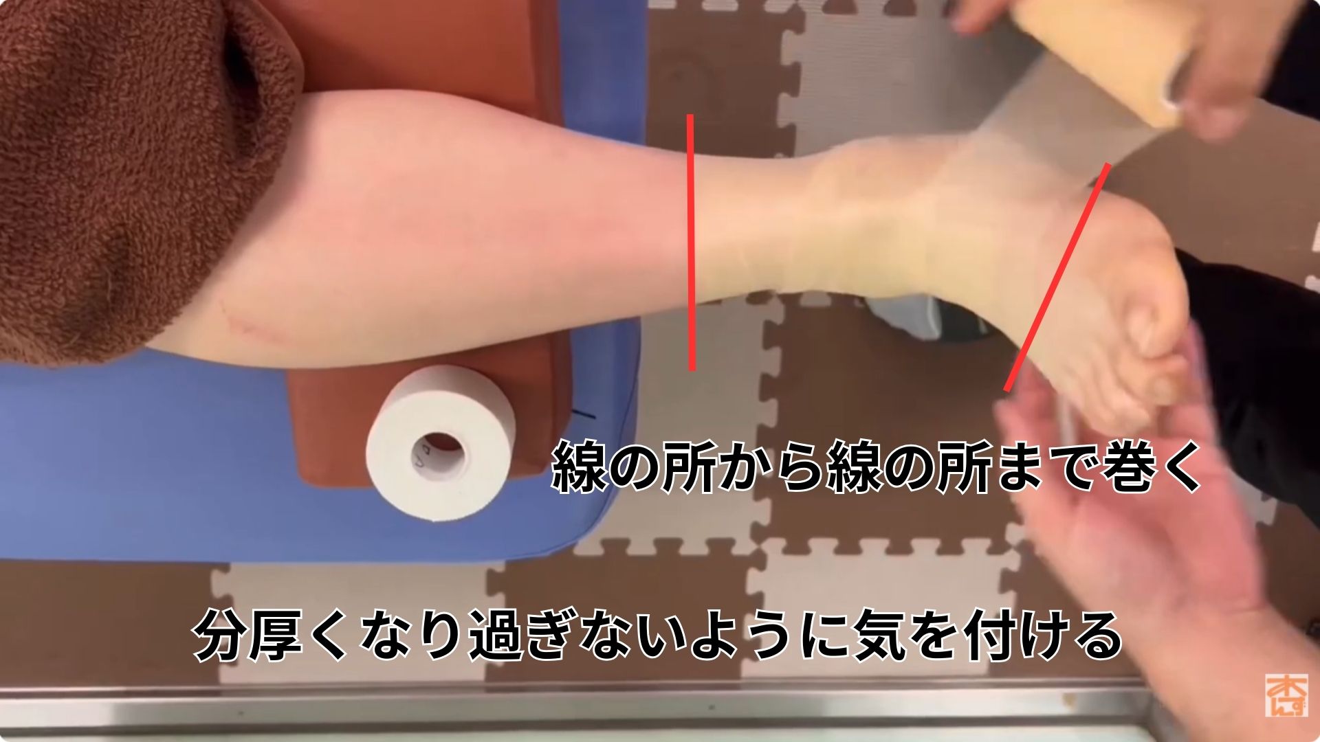 前足部につけたアンカーテープの所から始めて踵の後面を通って反対側に移ります。