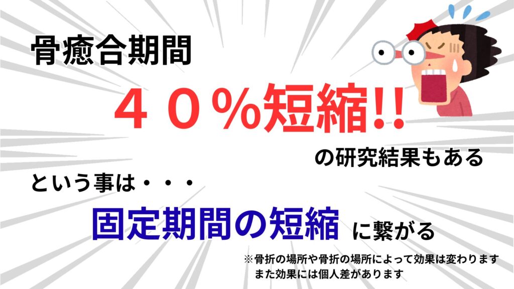 多くの臨床例から治療期間も確認され、骨が癒合するまでの期間を約40%短縮でき、遷延癒合や偽関節などの治りづらい骨折の発生率を低下させる効果があるとされています。