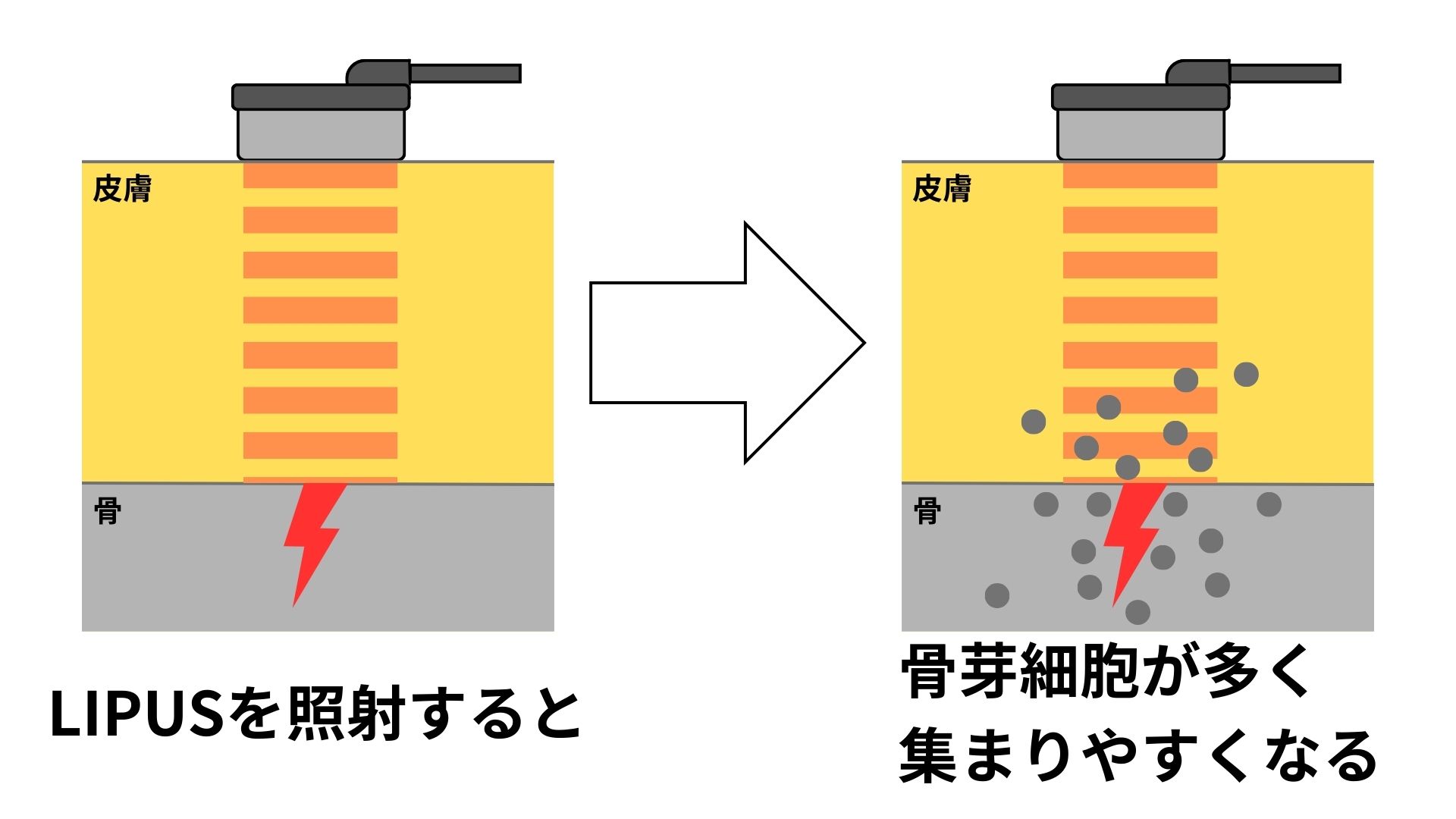 機器の説明の時にも少し触れましたが、LIPUSを照射する事で骨折部や身体の中の変化が起きる事で骨折が早く治っていきます。