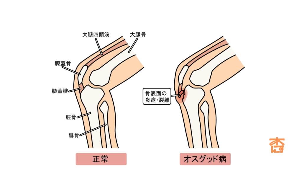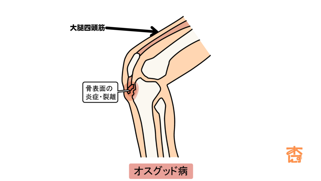 ジャンプや走る動作などで膝を繰り返し使うと、大腿四頭筋が膝蓋腱を通じて脛骨粗面を引っ張り続けます。