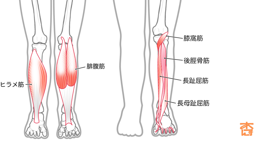 「長趾屈筋」は足の指を曲げる筋肉で、「後脛骨筋」は足のアーチを支える大切な筋肉です。「ヒラメ筋」というふくらはぎの筋肉も関係していると考えられています。