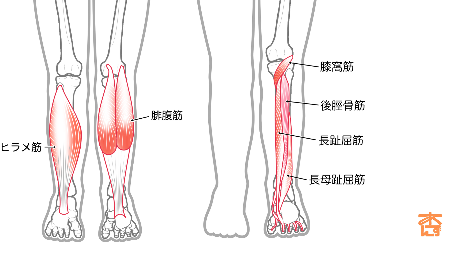 これらの筋肉は、すねの骨の内側に付いていて、走ったりジャンプしたりするときに骨を引っ張る力が働きます。