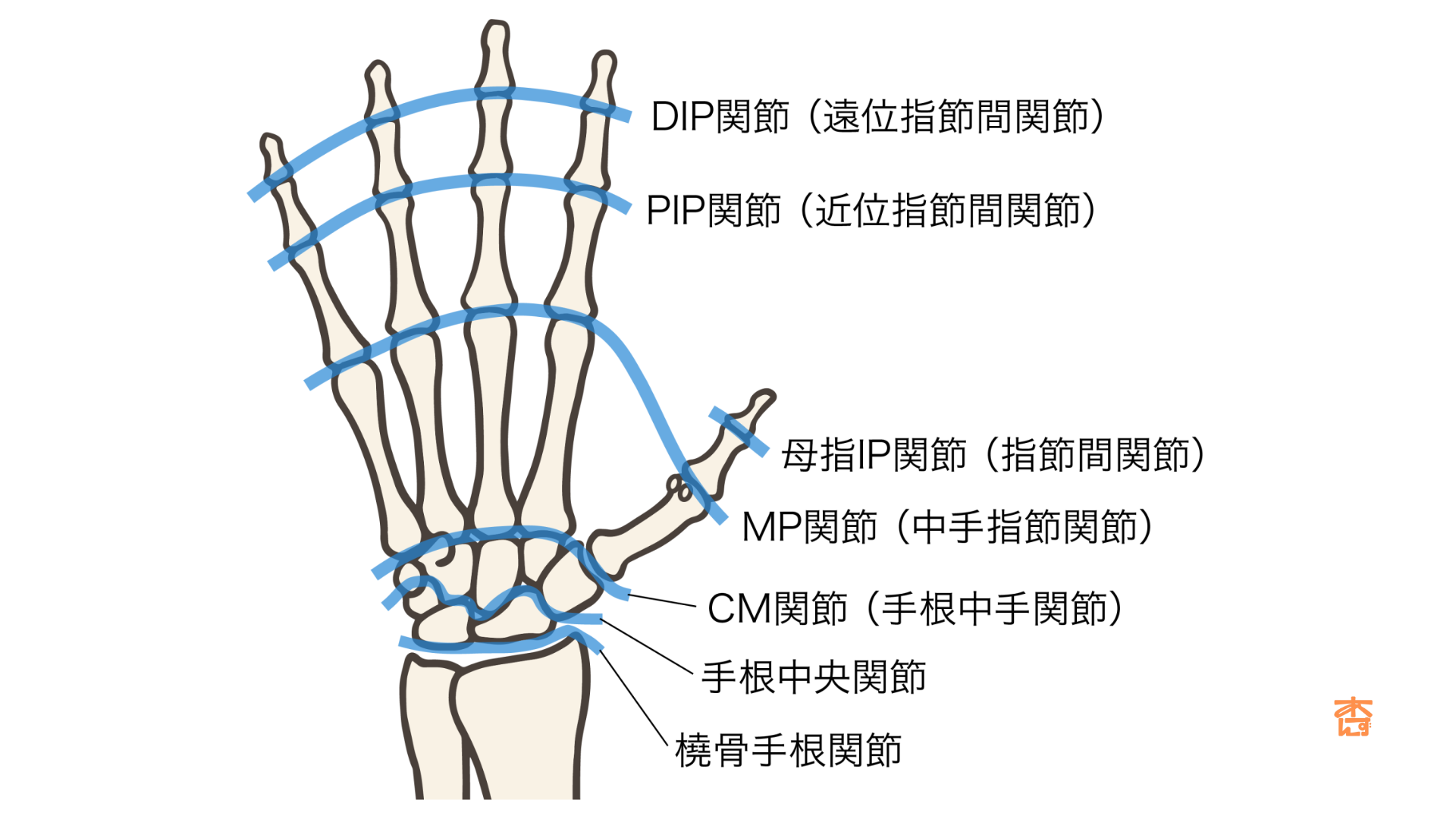 一番先端の関節をDIP関節(第一関節)、真ん中の関節をPIP関節(第二関節)、そして指の付け根の関節をMP関節と呼んでいます。