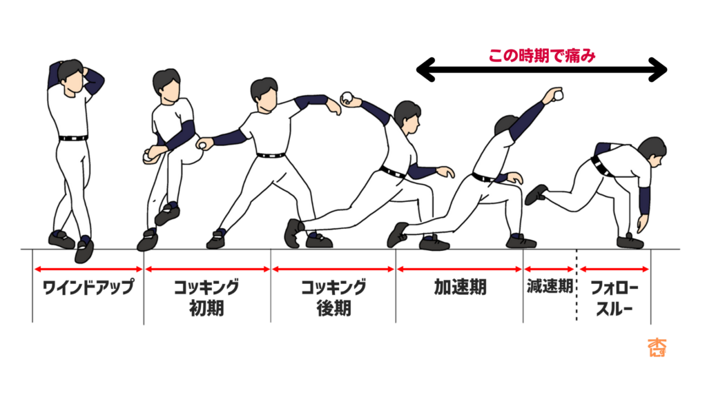 - 投球時、特にボールを投げ終わるときの肩の後ろ側の痛み
