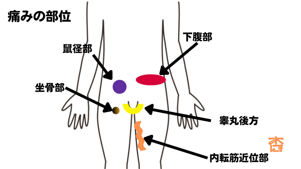 - 鼠径部、下腹部、太ももの内側などに感じる痛み