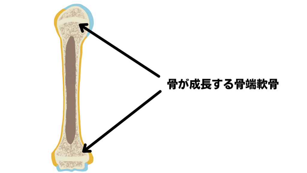 大人の骨は全体が硬い骨でできていますが子どもの骨はまだ成長途中なので一部が柔らかい軟骨でできています。この軟骨の部分が徐々に硬い骨に変わっていくことで身長が伸びていくわけです。