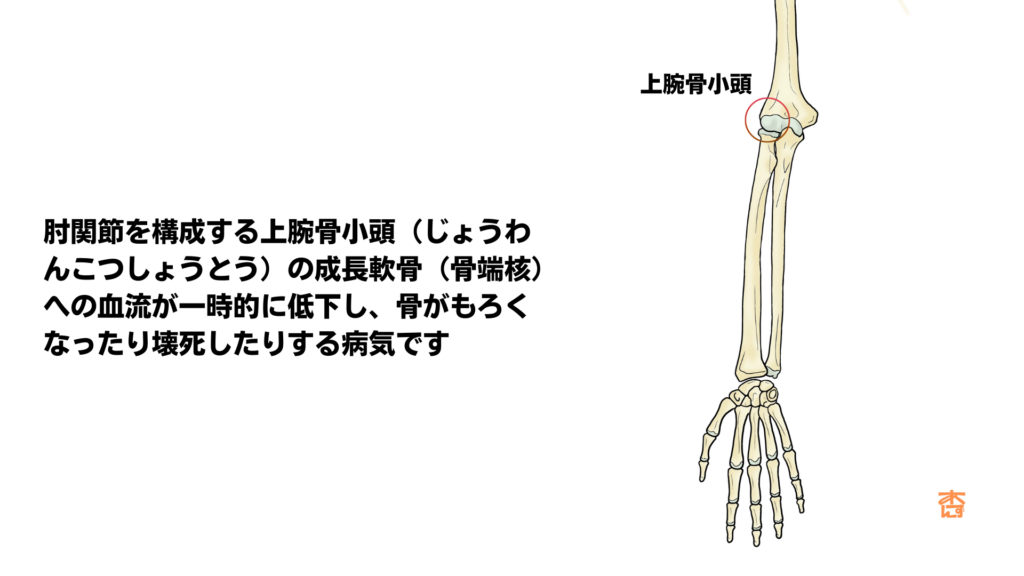 パンナー病は、肘関節の「上腕骨小頭(じょうわんこつしょうとう)」という部分に起こる病気です。上腕骨小頭とは、肘の外側にある骨の丸い部分のこと。ここは成長期のお子さんにとって、骨が伸びるためにとても大切な場所なんですね。