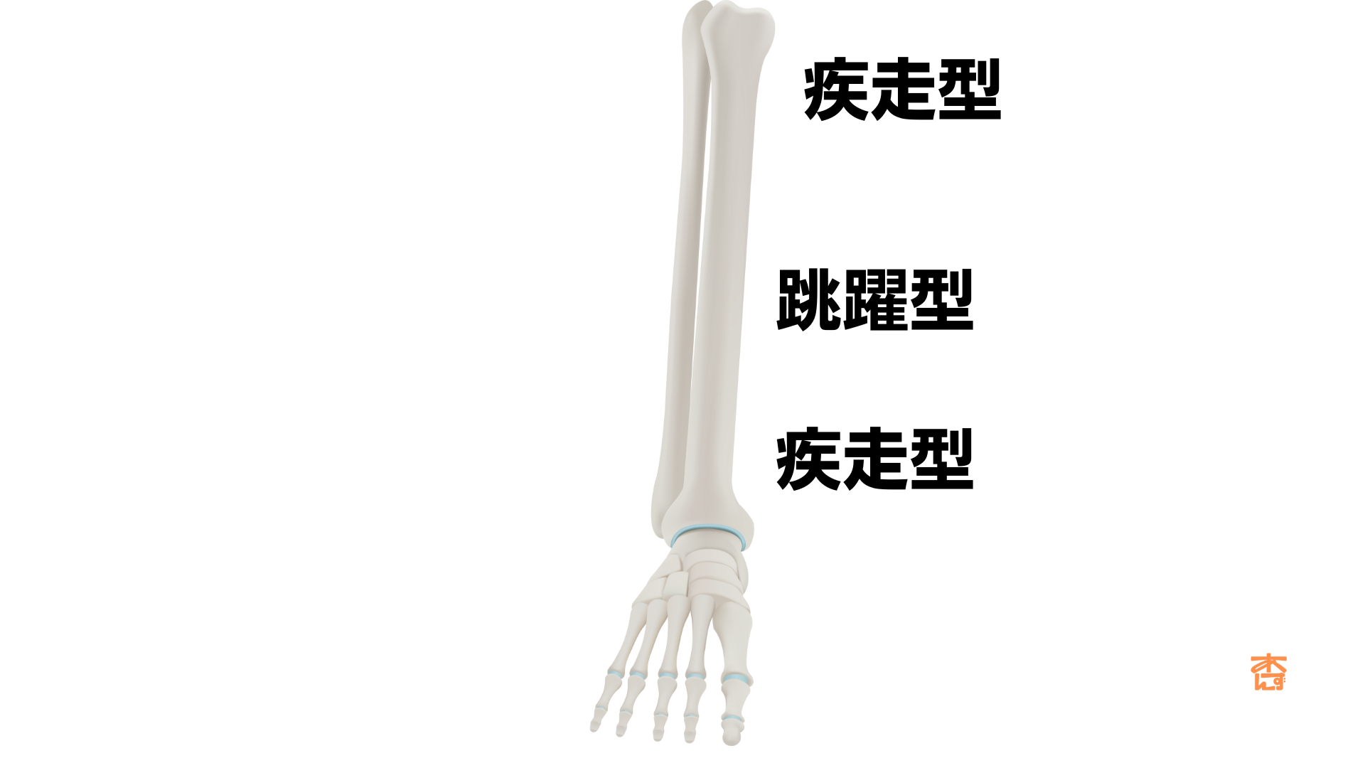 疾走型(しっそうがた) 走ることが多い競技(陸上の長距離走、サッカーなど)で起こりやすく、すねの骨の上の方や下の方に発生しやすいタイプです。