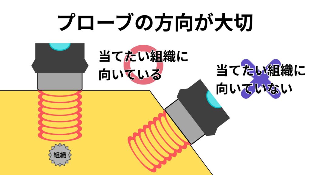 先ほども言いましたが超音波振動は真っ直ぐにしか進まないため当てたい組織にしっかりとプローブを向けていないと、超音波振動を当てる事が出来ません。