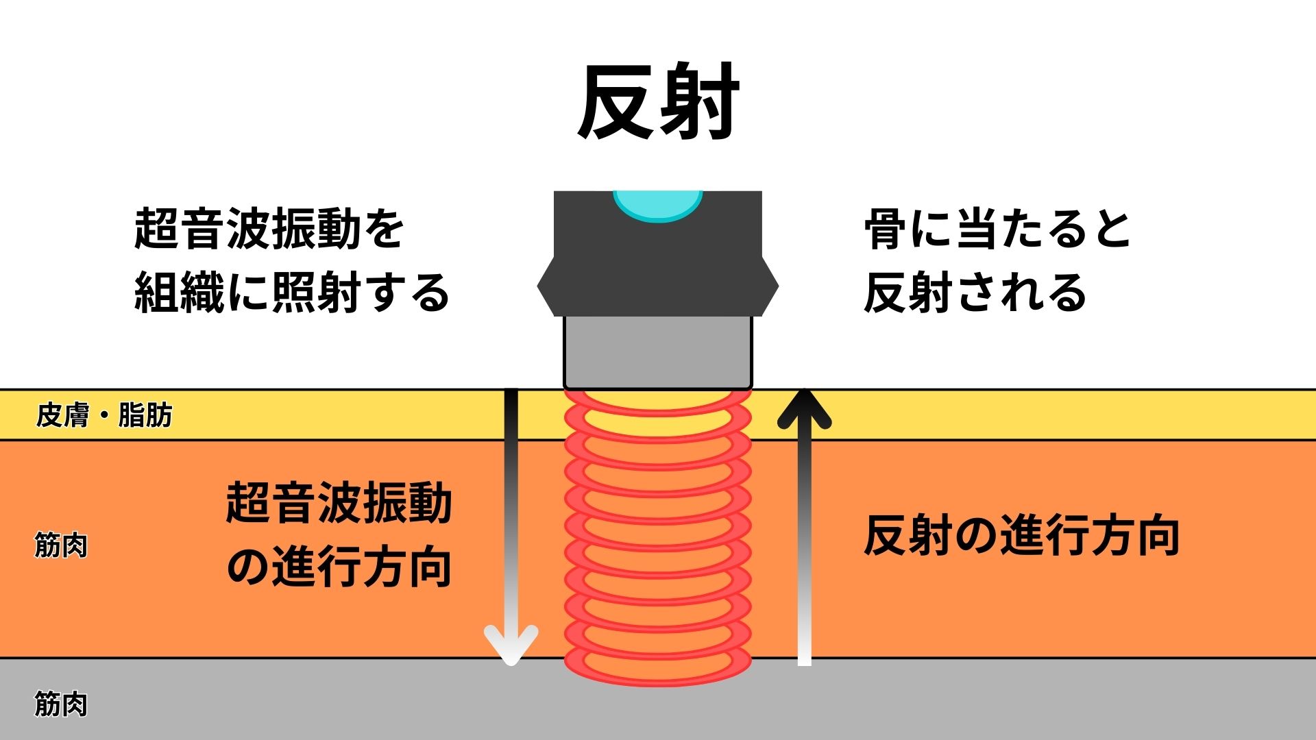 少し細かくいうと反射は骨だけでなく各組織でも起きていて、超音波振動が組織と組織の間を通る時に超音波振動の伝わりにくさ(抵抗)があるので、その時に多少なりとも組織からも反射をされてしまいますが、骨の場合は全く組織の中に振動は入らずに全て反射をしてしまいます。