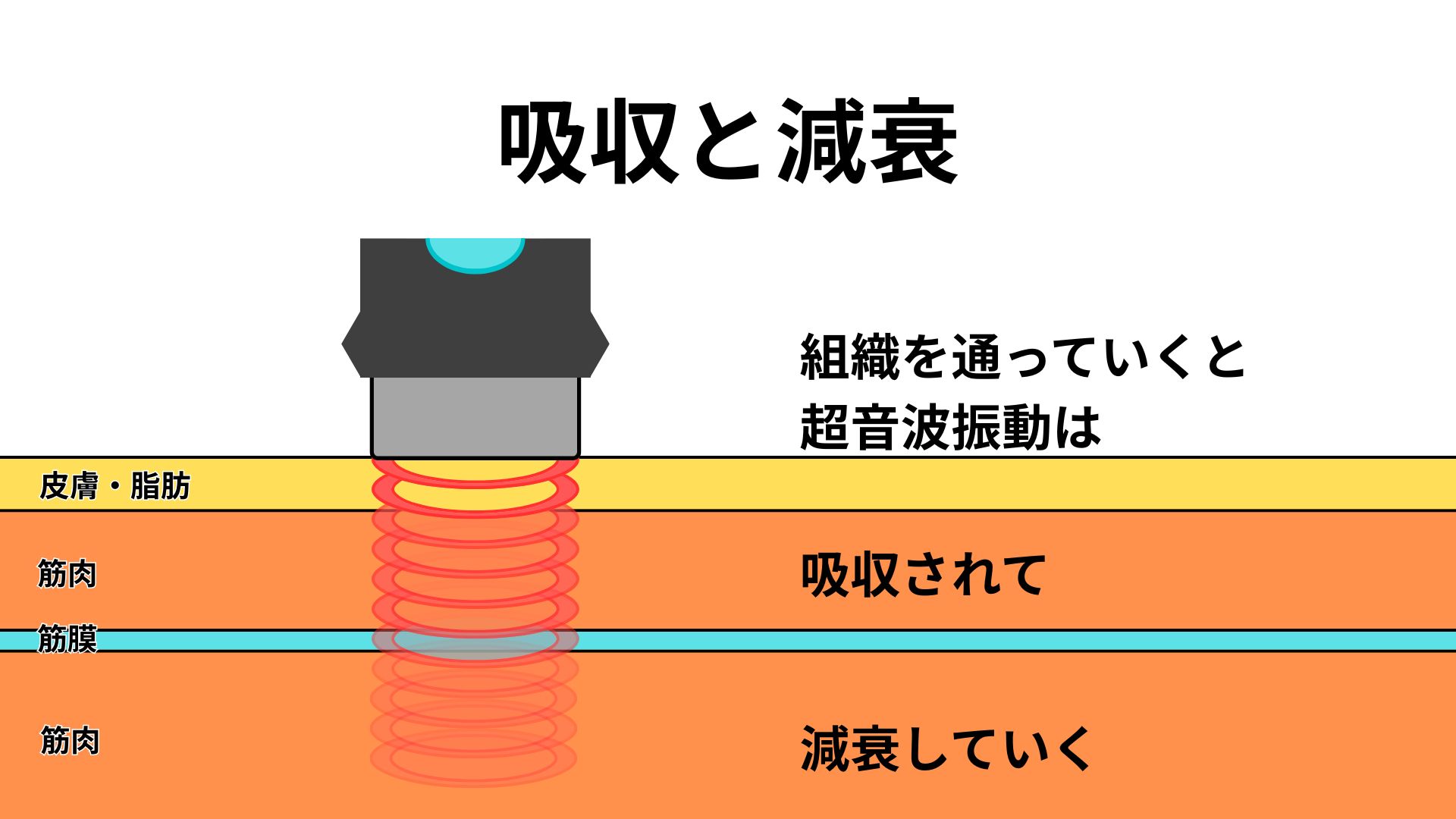 これを《減衰》というのですが、減衰が起きるのは超音波振動が組織に《吸収》されていくためです。