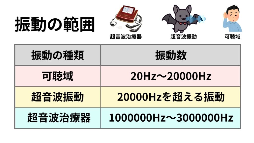 なので皆さんがよく耳にしている超音波というのは、治療器にしても家電製品にしても最低でも2万回は振動しているという事になります。