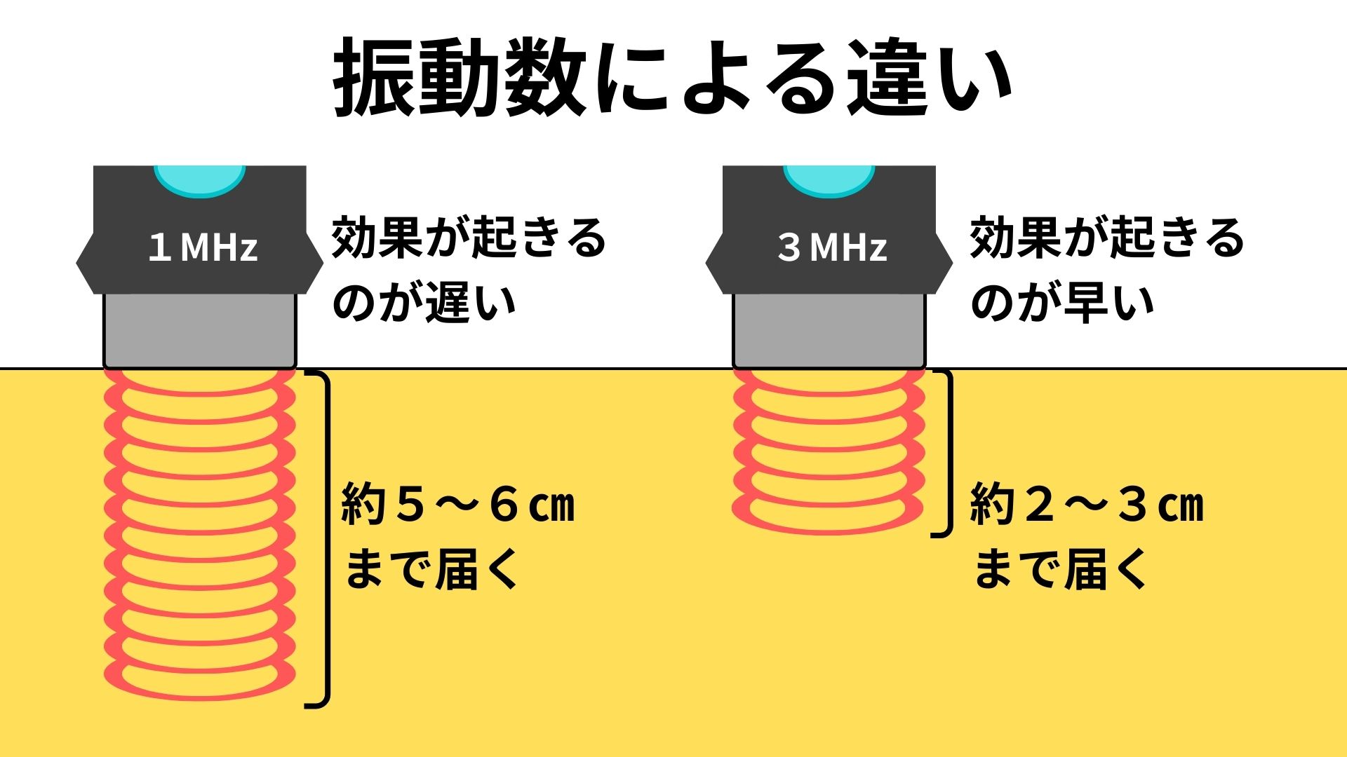 振動数が高い方(3MHz)が効果が出るまでの時間が早くなり、振動数が低い方(1MHz)が効果が出るまで少し時間が掛かりやすいです。